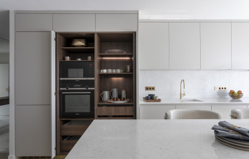 La touche de sophistication est apportée par des meubles hauts vitrés dont le verre fumé et l’éclairage intégré mettent en valeur une collection de verrerie qui se devine exceptionnelle. Le petit plus ? Une péninsule qui prolonge l’îlot central en un coin petit-déjeuner intimiste pour débuter la journée en douceur ! Ou comment faire rimer luxe discret et fonctionnalité maximale…