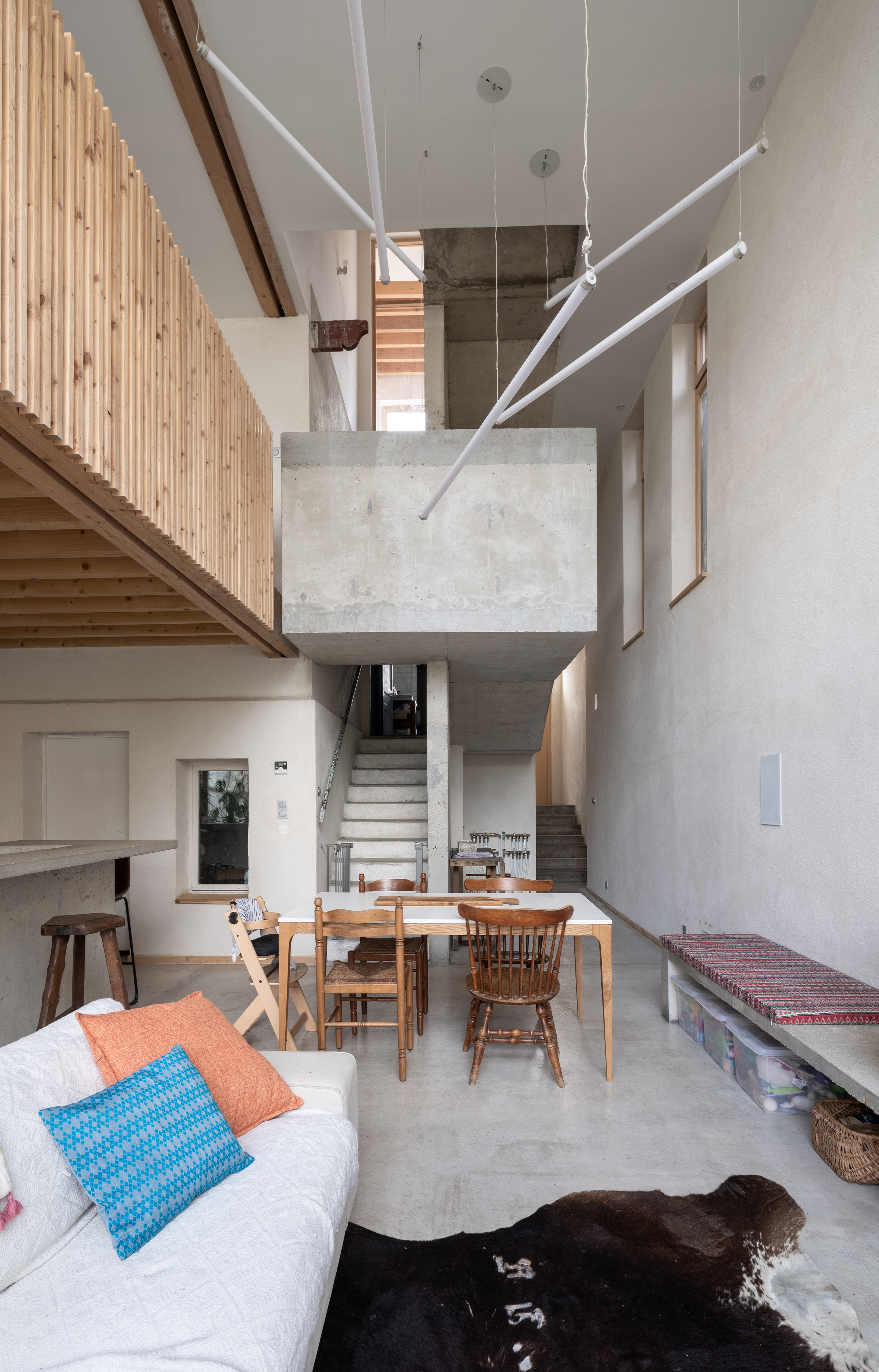 À l’intérieur, le discours est clair : pas d’ornement superflu, ni de carreaux à la mode. Le sol, l’escalier et la cuisine sont en béton brut ; le bois, laissé à nu. Loin d’une prétendue neutralité, ce minimalisme revendiqué donne à voir la matière dans ce qu’elle a de plus honnête — avec ses aspérités, ses tremblements, ses traces du quotidien. Et permet de passer l’épreuve du temps et d’accueillir aussi bien des meubles d’époque que des pièces cultes et même du mobilier anodin et chiné.