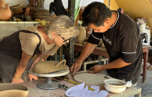 La céramiste Maria Paola Piras s’est par exemple inspirée d’un récipient de la période nuragique appelé s’Askoide. Sa version conserve la forme sensuelle de l’original mais joue avec les proportions, à travers notamment une anse exagérée. Disposant d’un finition unique, chaque vase utilise de l’argile, en proportions variables, provenant des vignobles – Sa Tanca, Is Solinas et Sisini – servant à produire le Turriga.