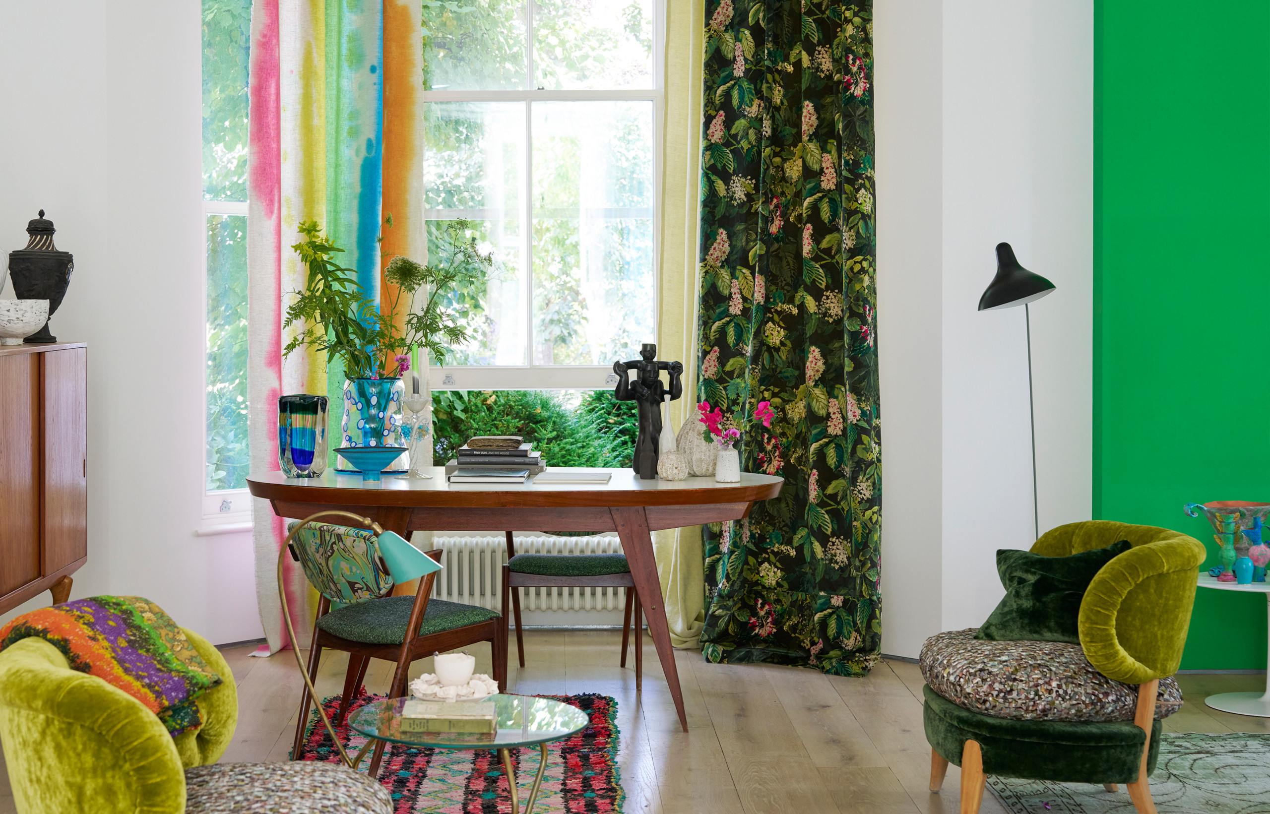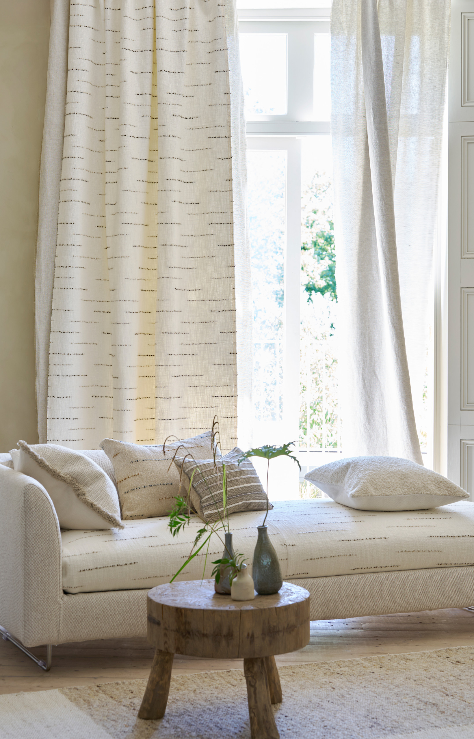 Tout repose sur une base neutre et terreuse, mais offre une palette, en touches, d’une richesse exceptionnelle. Les 27 tissus à motifs de la collection ont chacun leur particularité. Sancreed, Teasel, Daphne ou July sont composés de magnifiques broderies aux couleurs douces ; Brera Arte ou Harlyn Bay, conçus à partir d’une technologie de pointe permettant des teintures artisanales par pulvérisation, semblent avoir été faits à la main avec leurs airs de tie-and-dye élégants.