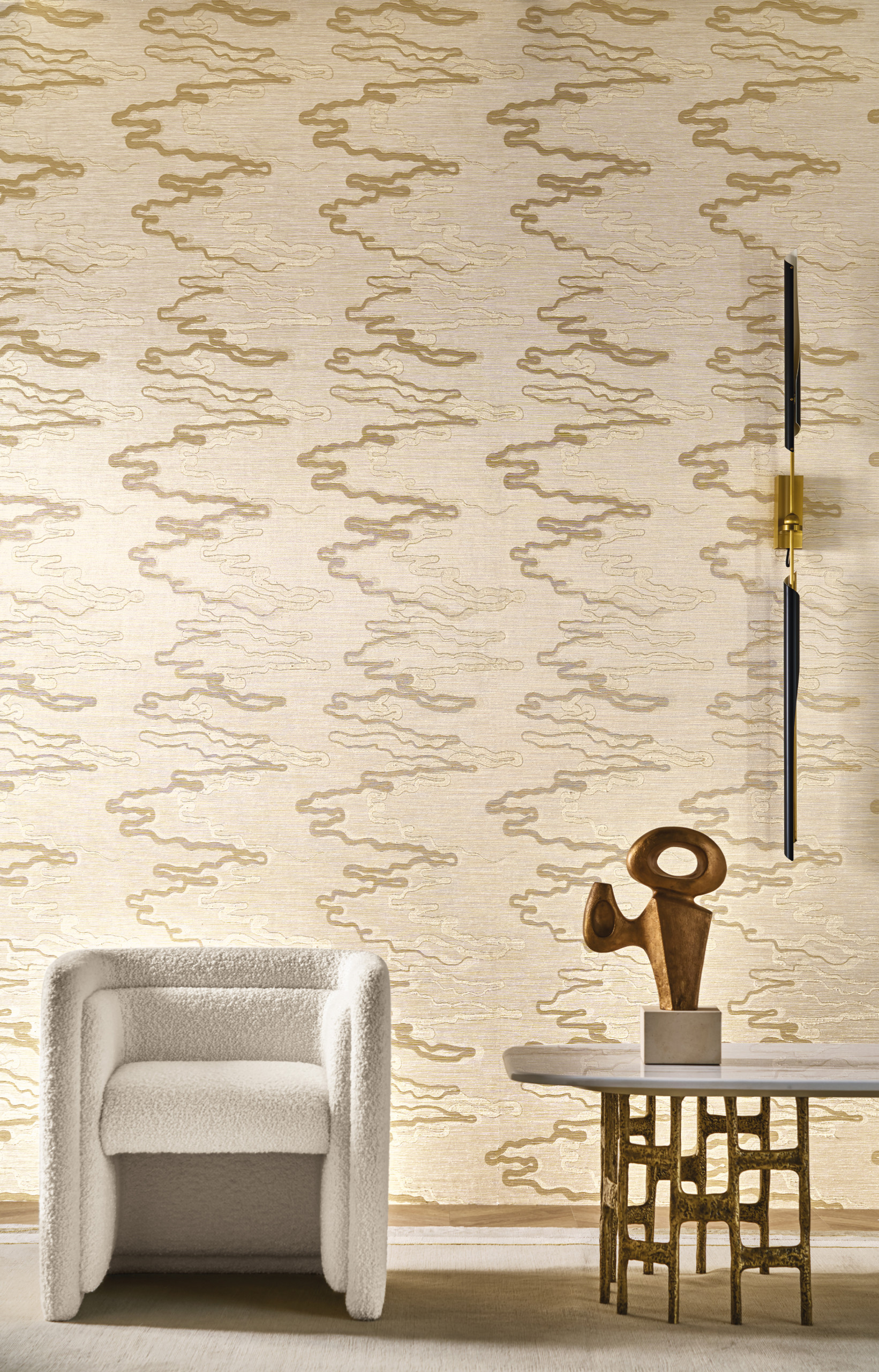 Leurs supports, en fibres de lin ou de coton, sont parcourus de motifs en fils métallisés, créant des détails cuivrés ou argentés aux reflets scintillants. De grandes lignes abstraites pour Il était une fois Paris Wall ou Gold Wall au mouchetage félin de Dora Wall, en passant par les ondulations aléatoires de Chant des Cigales Wall (photo) ou le jacquard veiné comme du bois ancien des Précieuses Wall, chaque pièce peut se coordonner avec le tissu du même nom. Des créations murales raffinées.