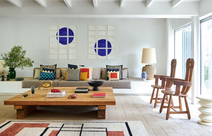 Et si l’atmosphère marine de cette maison située à la campagne était bel et bien présente, impensable d’adopter pour autant l’allure d’une cabane de plage. Rodrigo Izquierdo choisit plutôt de s’inspirer de l’élégance et de l’intemporalité de la côte ligure ou de la Côte d’Azur des années 60. Un style épuré, géométrique, soutenu par une palette méditerranéenne assez basique. « L’utilisation de couleurs primaires a été un choix délibéré, clin d’œil aux vacances qui représentent un moment de retour à l’essentiel. Un “essentiel” qui réside aussi dans le choix d’utiliser des objets pour la fonction pour laquelle ils ont été créés. »