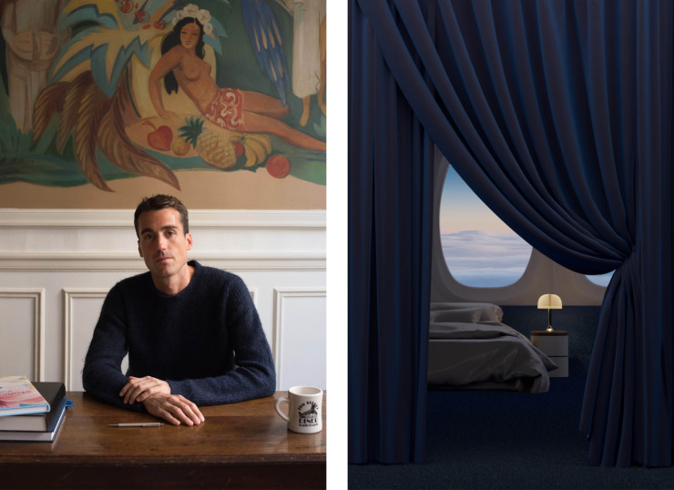 « On a installé des hublots, ceux que j’ai dessinés pour un restaurant PNY, et y défilent derrière, des paysages futuristes entre nuages et espace intergalactique… » L’installation, née d’une conversation sur la poésie avec les organisateurs du salon, plonge le visiteur dans une atmosphère onirique et légèrement décalée. « Le visiteur traverse des rideaux en velours bleu nuit, un peu à la David Lynch, avant de découvrir des stèles présentant des objets qu’on retrouvera dans la pièce mais commentés avec des textes et des voix. » Une déambulation sensorielle, entre futurisme et nostalgie, inspirée du film 2046 de Wong Kar-wai.