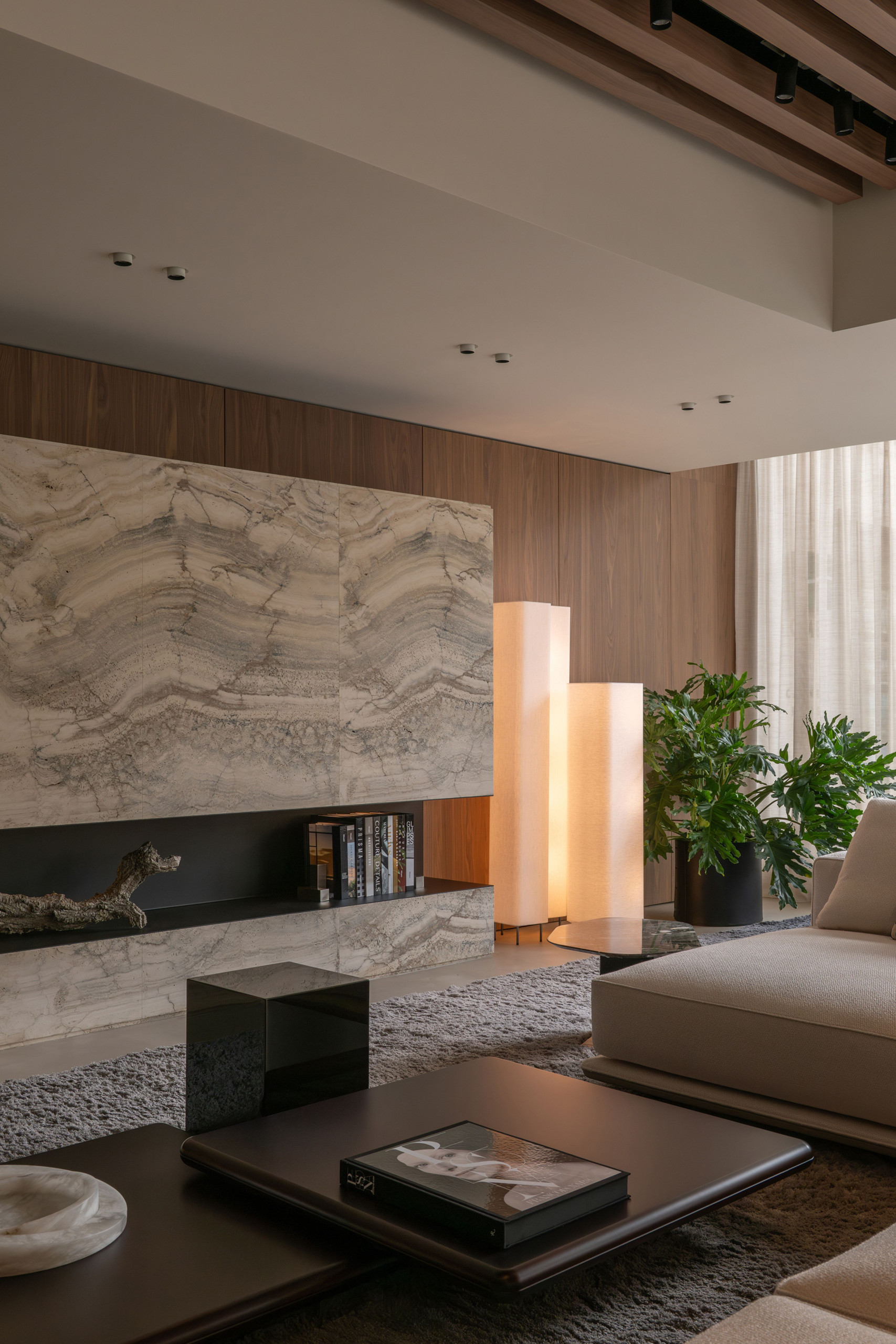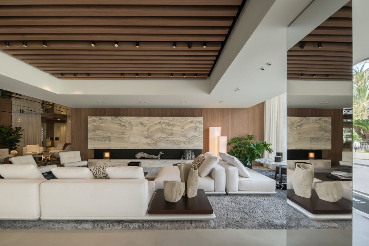 En léger retrait, le lieu joue parfaitement la porosité entre intérieur et extérieur avec ses deux façades en angle, vitrées sur toute leur hauteur. Cosigné par le studio d’architecture intérieure de Designset et Minotti Studio, l’agencement est un cocktail élégant de béton gris pour le sol, de lattes de Frozen Walnut et de panneaux de travertin Silver Wild pour les murs. Le tout démultiplié par les plafonds, parfois intégralement habillés de miroirs.