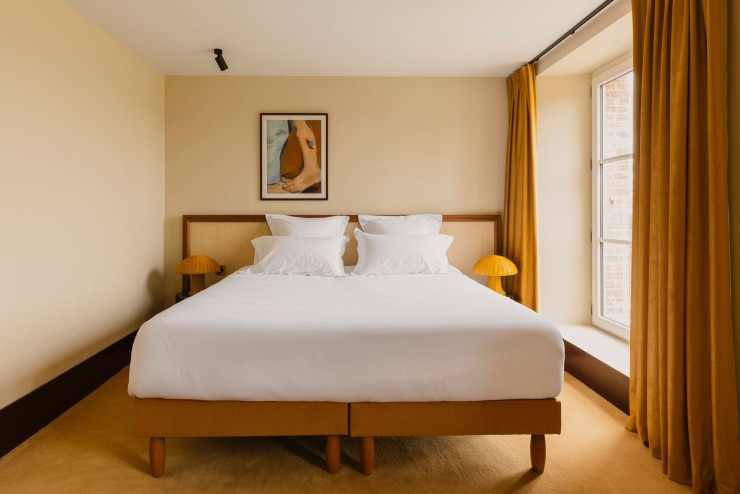 Dans ce bâtiment se trouvent le bar, le restaurant aux airs de jardin d’hiver et le salon-bibliothèque cosy avec sa très belle cheminée en céramique. La décoratrice Gwenaëlle Girard a été choisie pour, résume-t-elle, « retranscrire la simplicité et la générosité du projet. J’ai dessiné la moitié du mobilier et travaillé les associations de couleurs pour impulser une énergie positive, construire des univers différents dans les chambres autour du beige, du rose et du bleu ».