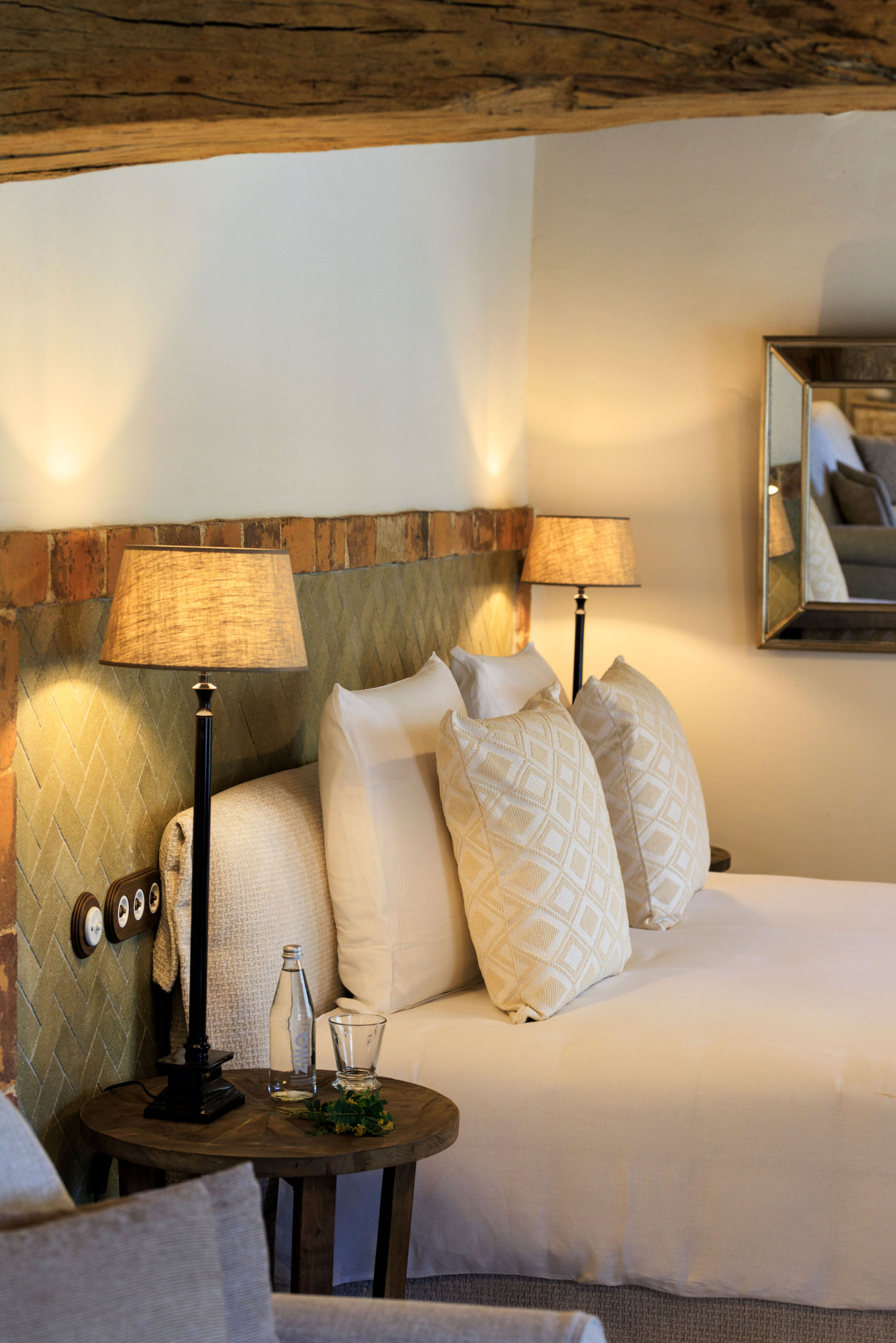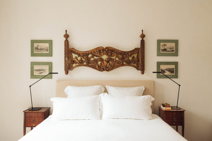 Les chambres brillent par leur simplicité et leur authenticité : murs immaculés et décorés de quelques lithographies du XXe siècle qui contrebalancent des têtes de lit en bois travaillé (provenant pour la plupart d’anciens lits à baldaquin), chaises tapissées, lustres à pampilles et miroirs dorés. L’équation entre ancien et moderne se tient sur le fil de l’élégance.