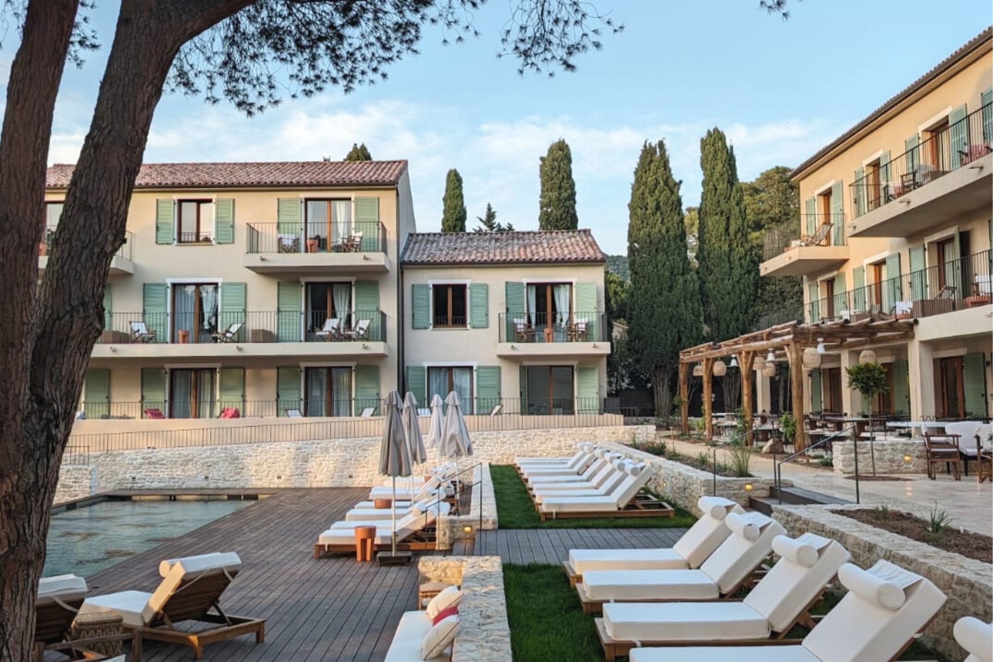 Même quelques semaines après l’ouverture, le lieu semble déjà avoir connu mille vies. Les tilleuls et les cèdres du Liban centenaires, qui entourent le domaine, n’y sont pas pour rien. À l’écart, la piscine et son bar sont entourés de verdure et deux suites aux beaux volumes se logent dans des bergeries. D’autres arriveront au cours des ans, au même titre qu’un second restaurant près de la piscine et d’un spa de 1 200 m² de la marque de soins issus du maquis Nucca, création des propriétaires de l’hôtel et disponible dans les 22 chambres. B.P.