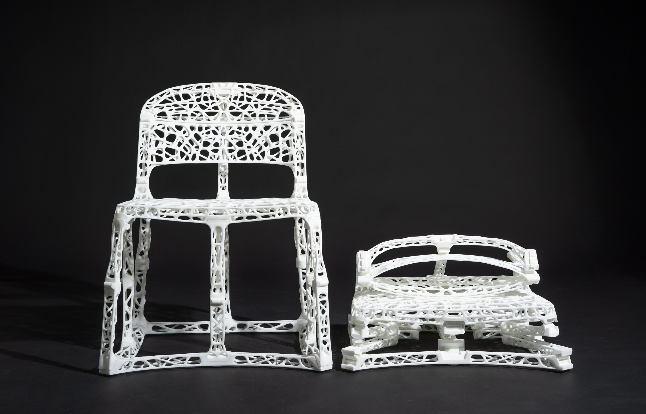 La fabrication s’affranchit des processus traditionnels tels que l’usinage, l’assemblage ou le moulage. Les 23 éléments et les 33 articulations sont imprimés et assemblés d’un seul tenant, à partir de poudre de polyamide. La chaise pèse trois kilos. « C’est fascinant, s’étonne Patrick Jouin. Depuis un siècle, on s’emploie à épurer le design, et nous avons ici une esthétique nouvelle, à la fois très sophistiquée et délicate. Elle se rapproche des créations de la nature. Cela ouvre des questions philosophiques vertigineuses. »