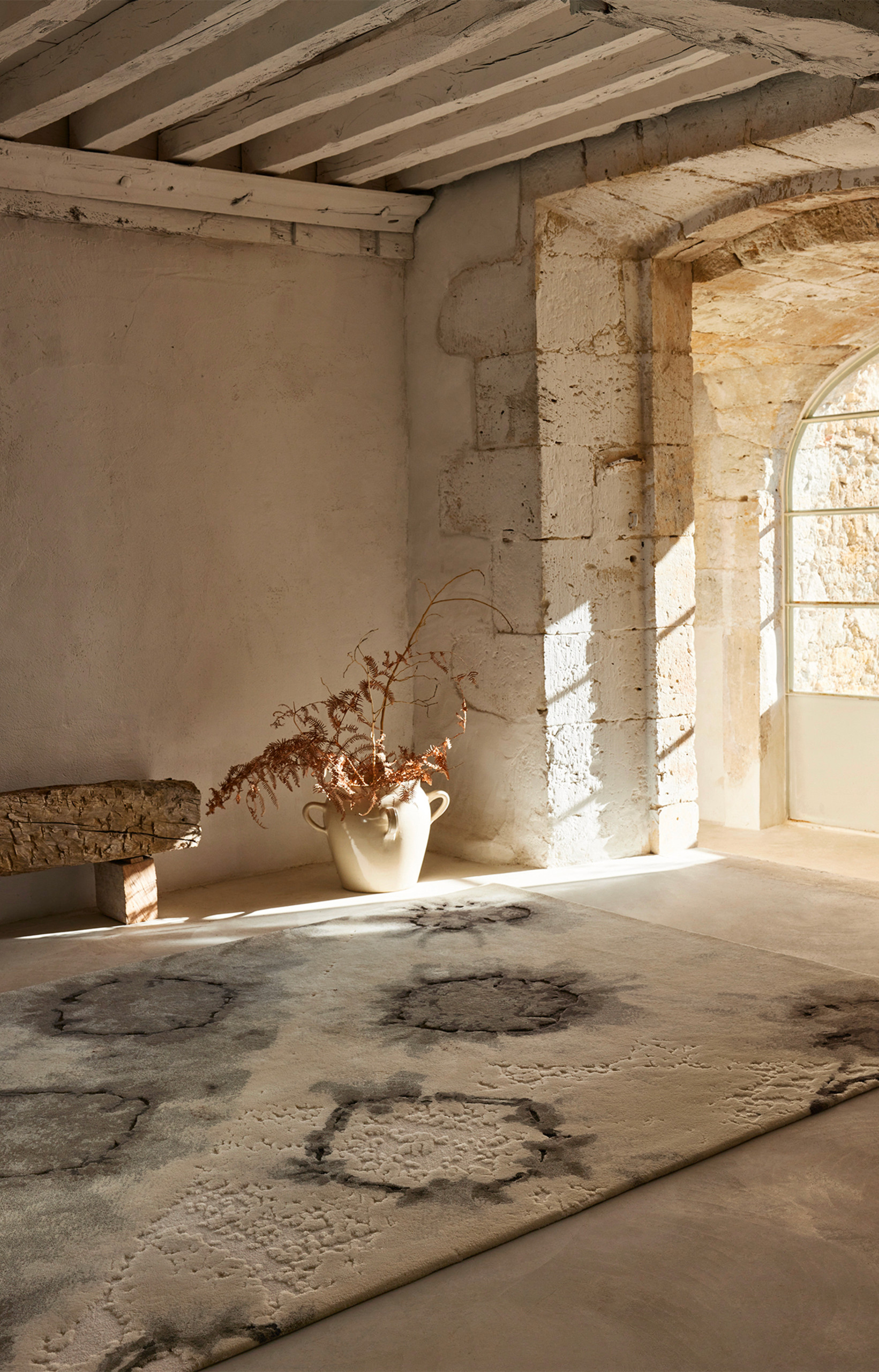 Haut de gamme, la Biophilic Collection s’apparente à de la haute couture. Ses huit modèles mettent à profit toute l’expertise de la maison : les dégradés, les différences de hauteurs, les ciselures sont poussés à leur maximum. Sans colorant, en panachant les nuances trouvées dans la nature, les dessins produisent le même effet que le shibori, la technique japonaise de teinture tie and dye. On croit y lire des impressions d’encre. Différentes fibres (laine, soie et jute) sont mélangées, rendant la composition plus subtile encore.